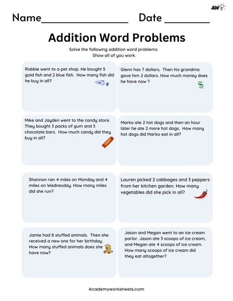 These grade 1 math worksheets have word problems involving the addition of single digit numbers. These problems can be solved mentally or. Solve word problems involving addition and subtraction facts.